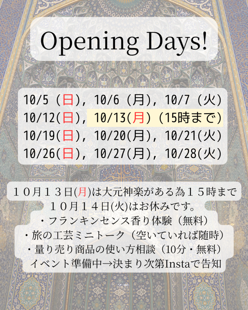 世界の手仕事屋 HINUITO 営業カレンダー2025年10月分