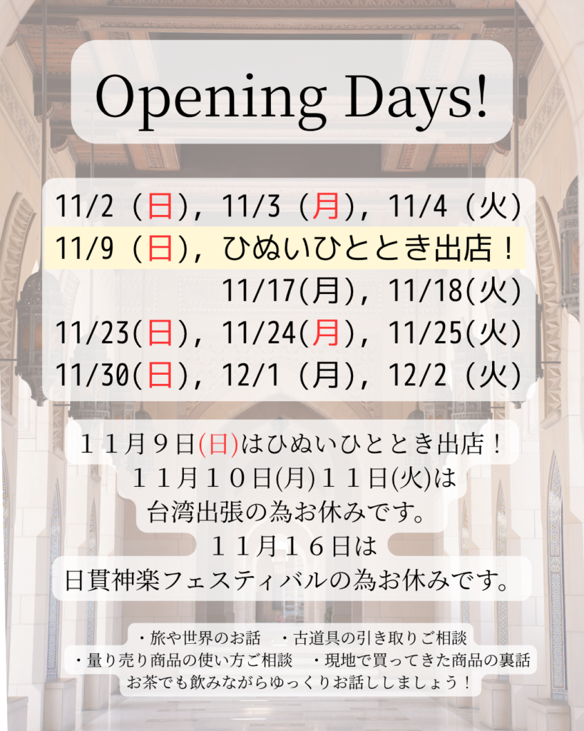 - 世界の手仕事HINUITO2024.11月営業カレンダー