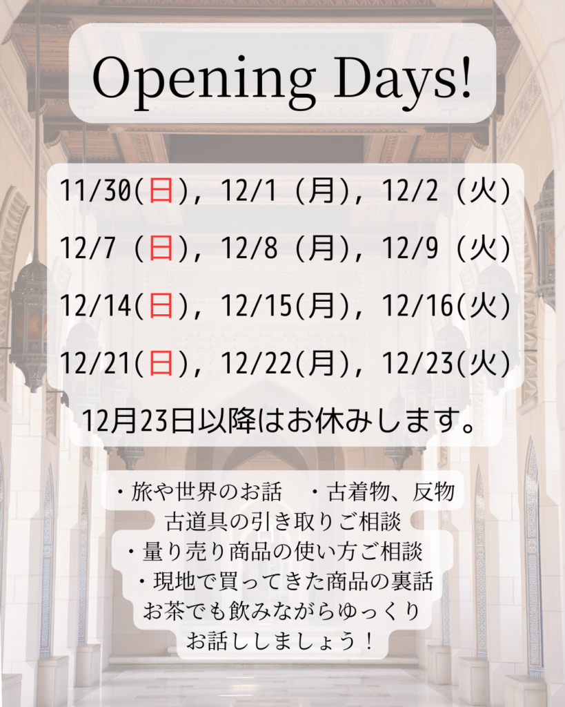 世界の手仕事屋 HINUITO 営業カレンダー2025年11月分